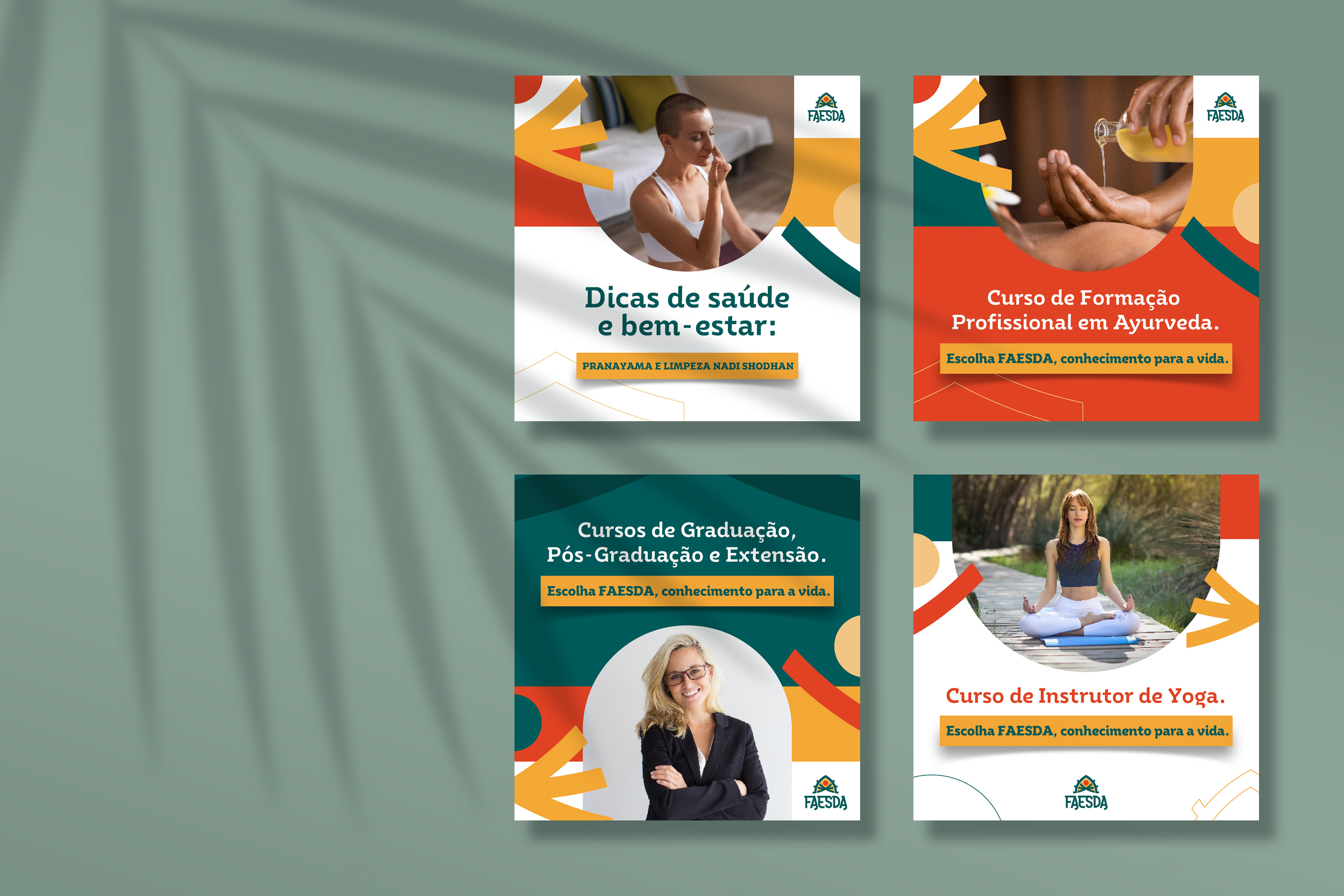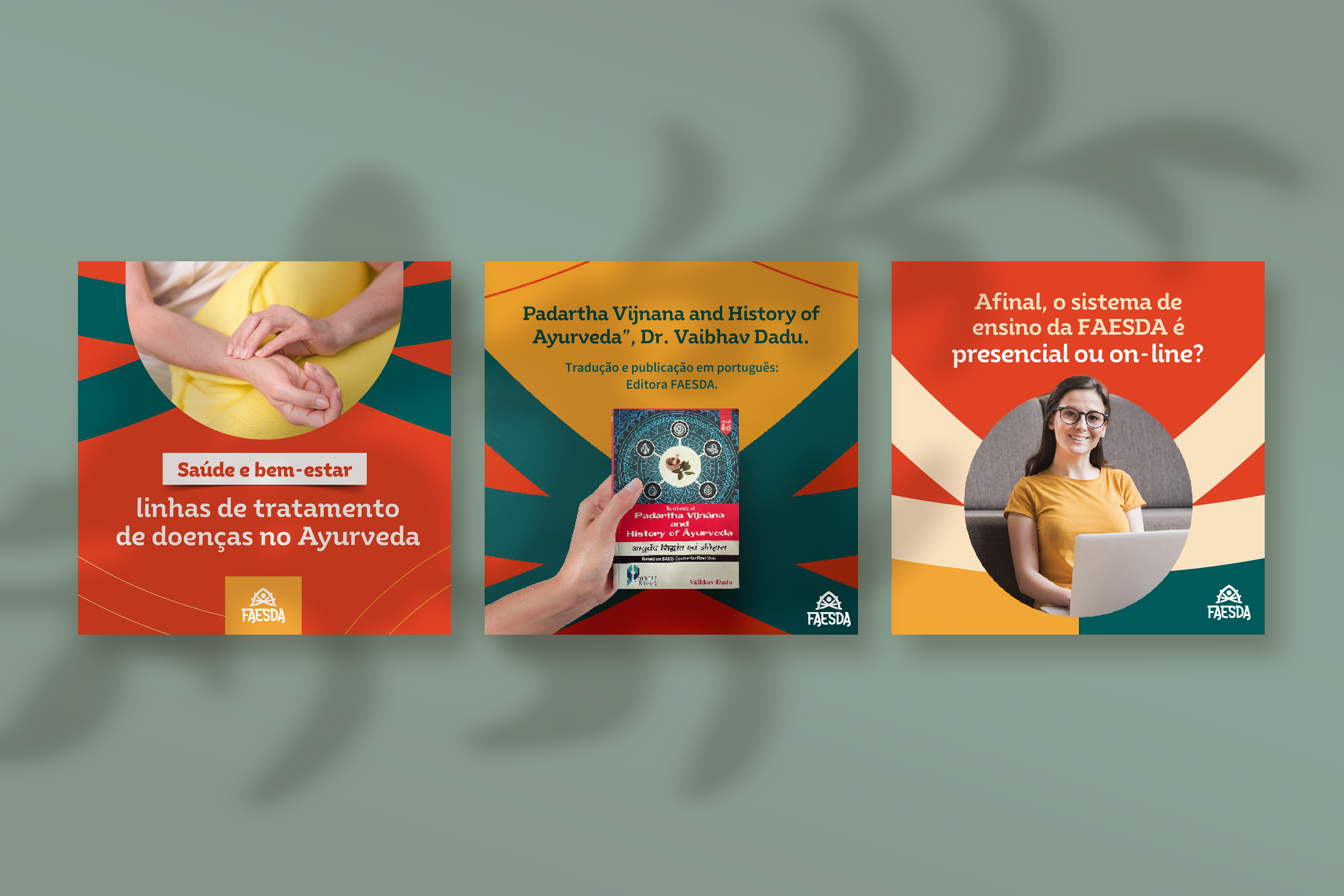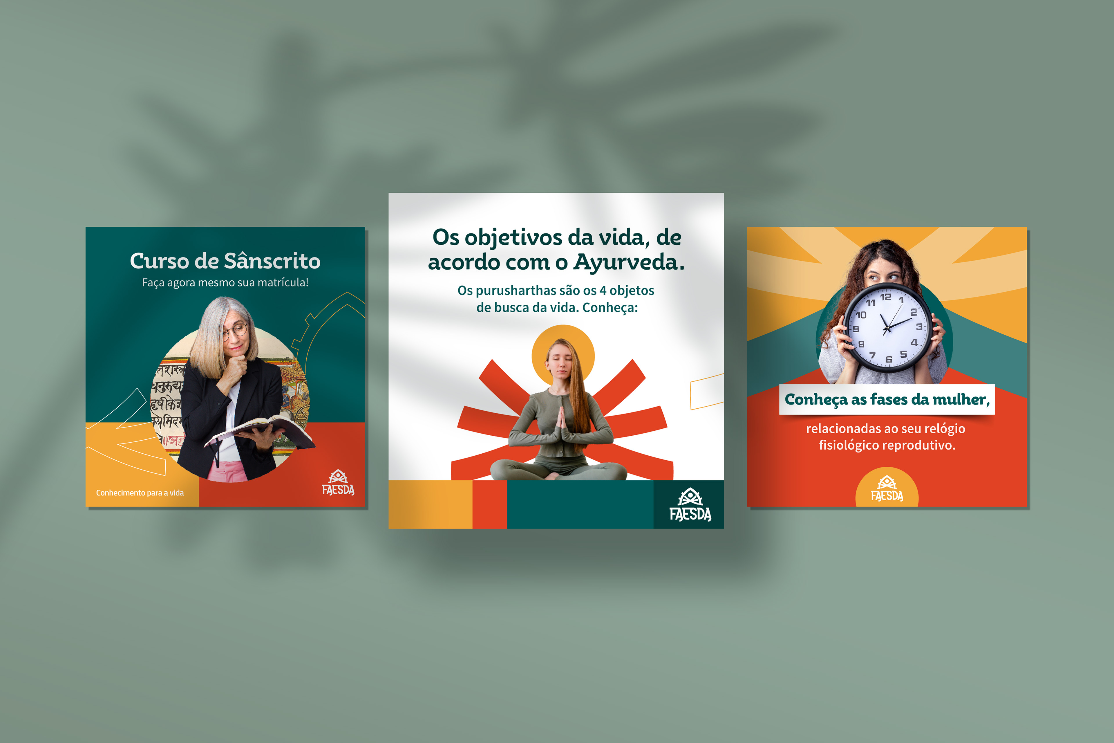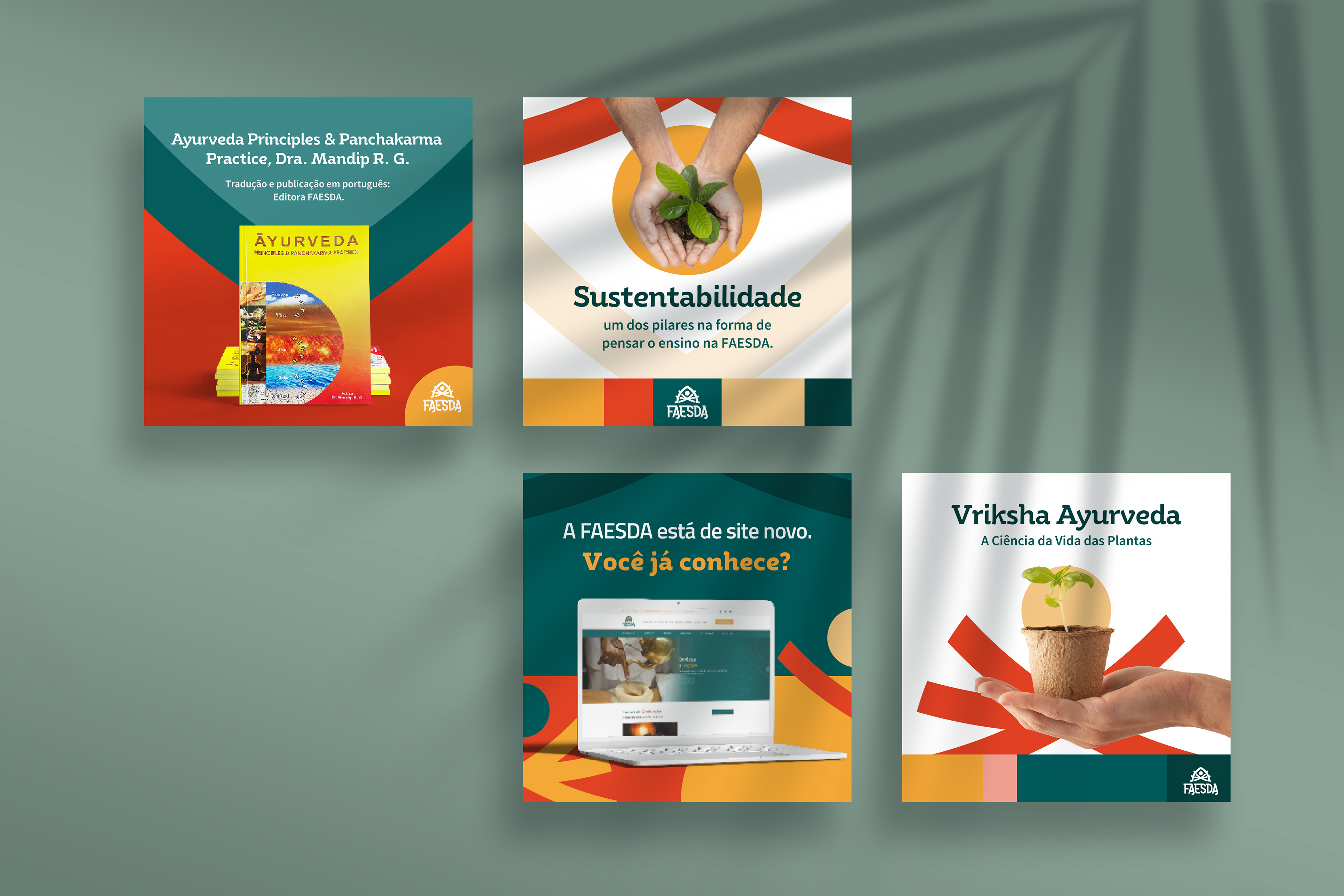 Criação da identidade visual para as redes sociais da FAESDA, a primeira faculdade de Ayurveda do Brasil, unindo tradição, conhecimento ancestral e comunicação contemporânea.