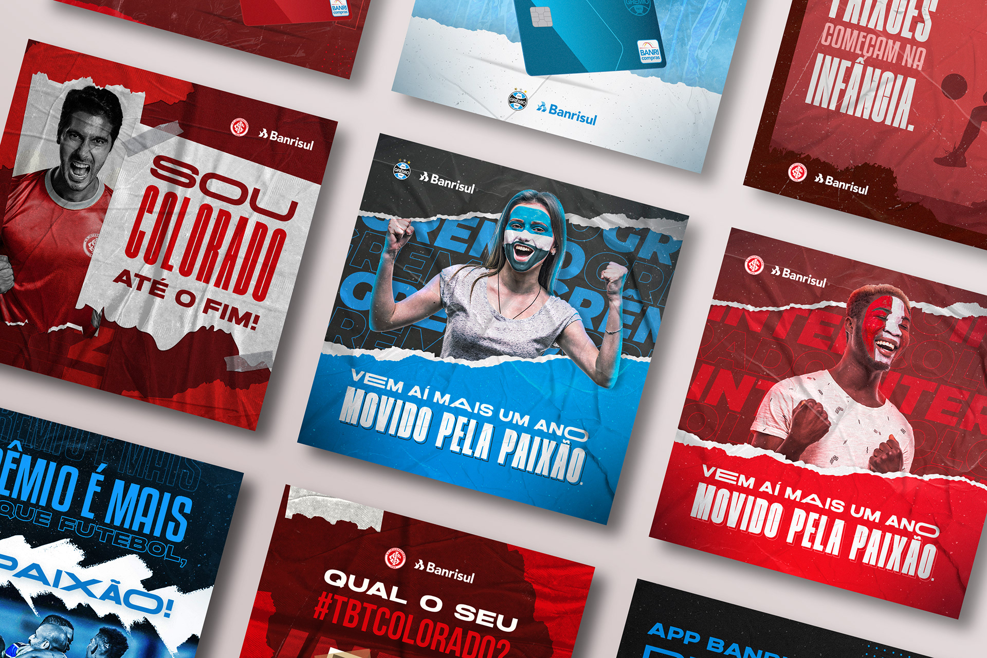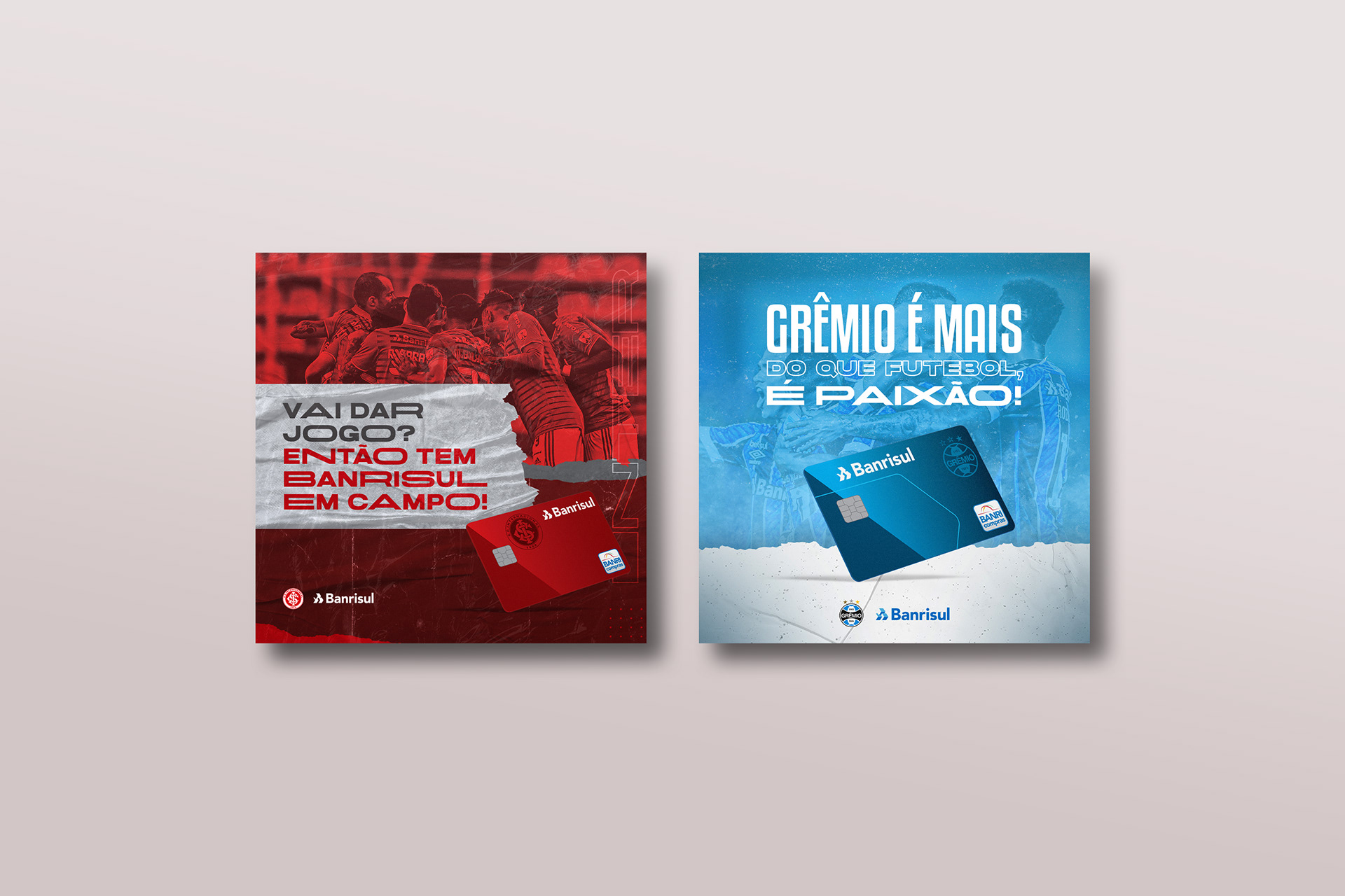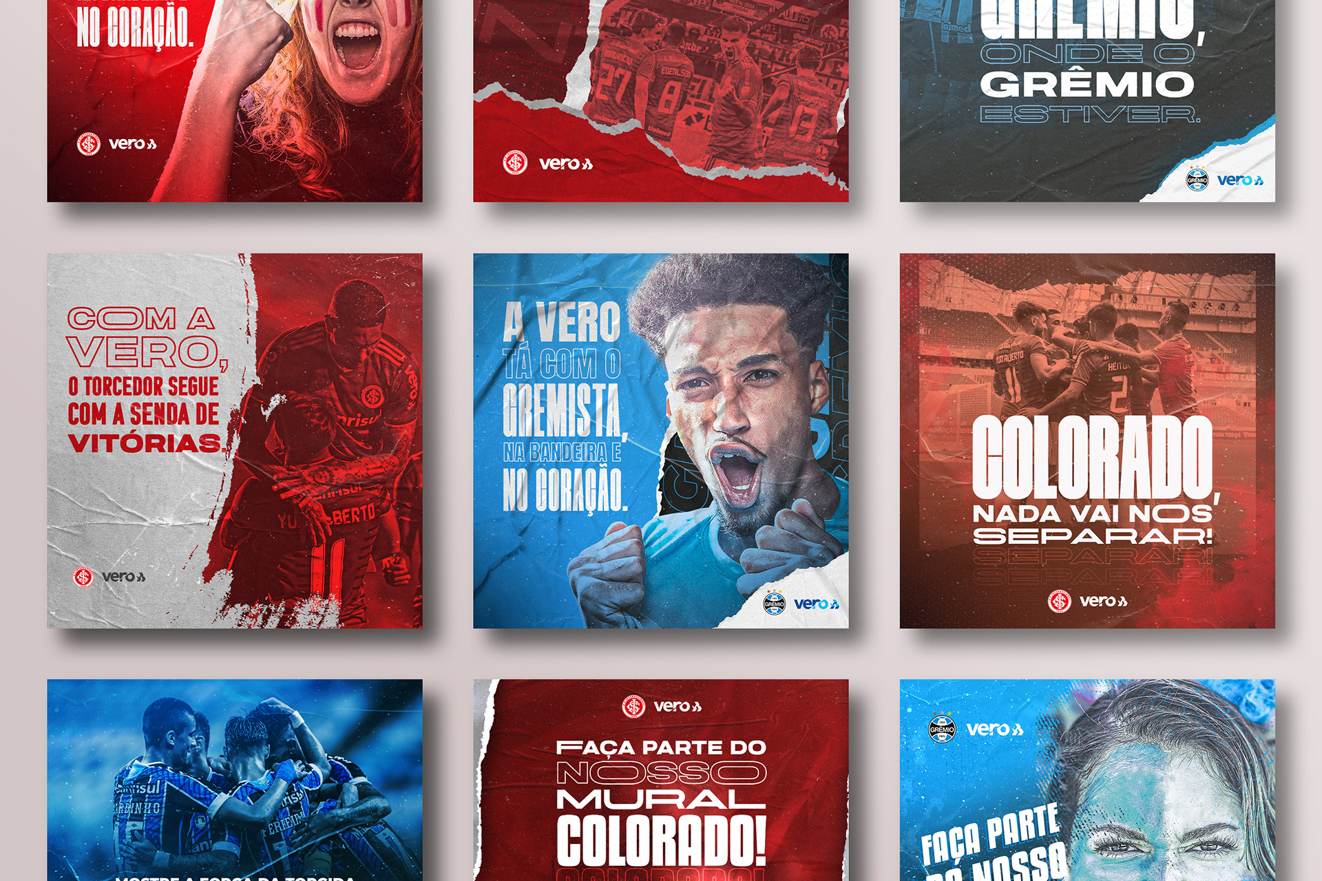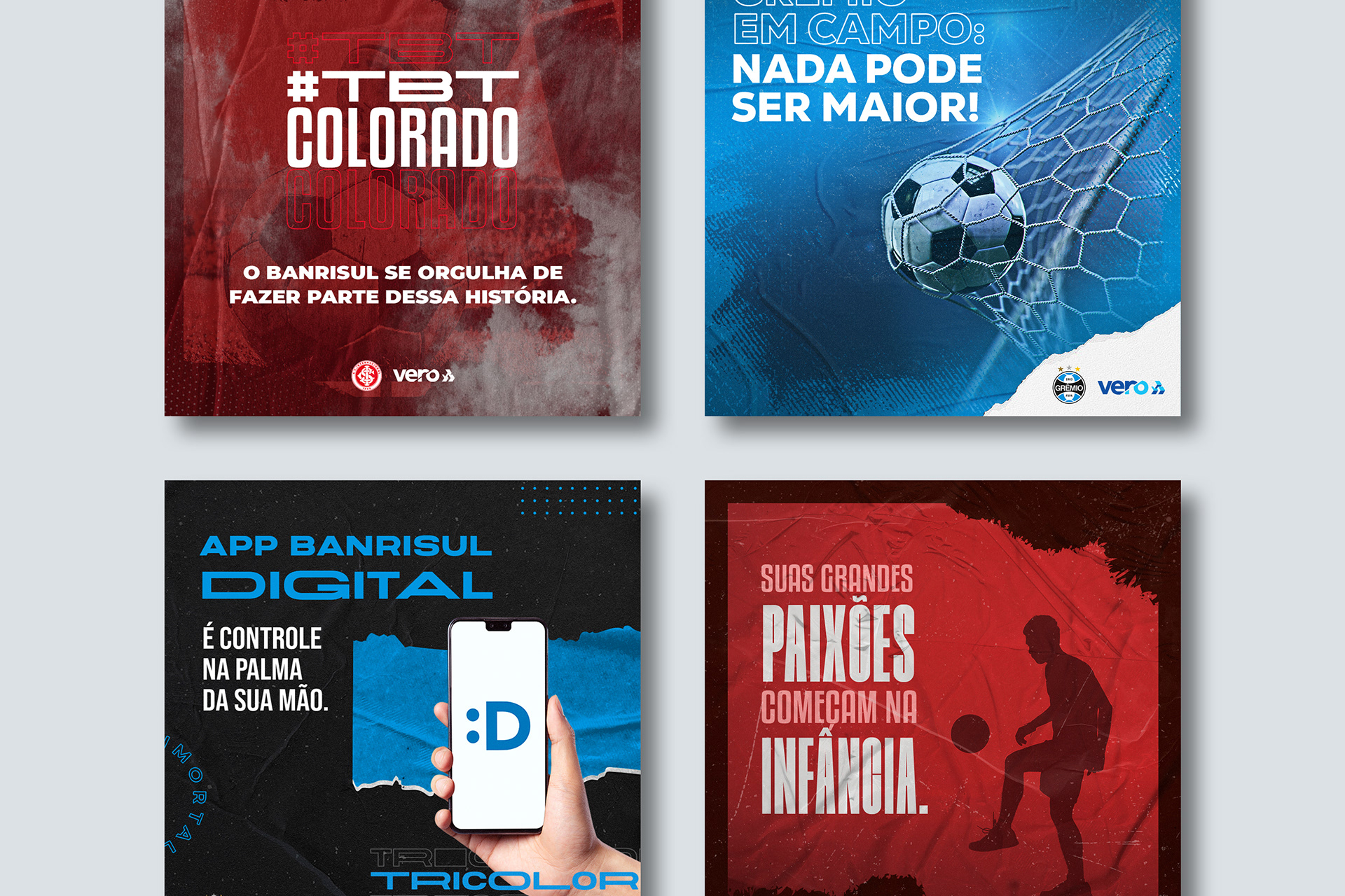 Criação de uma série de posts para Grêmio e Internacional, patrocinados pela Vero Banrisul, destacando os cartões personalizados de cada time, com identidade visual coesa da marca e adaptações específicas para cada clube.